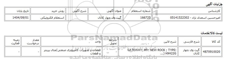| امیرحسین اسعدی نژاد - 05141522302 | 166725 | گیت وی چهار کانال | استعلام الکترونیکی | 1404/09/01 |