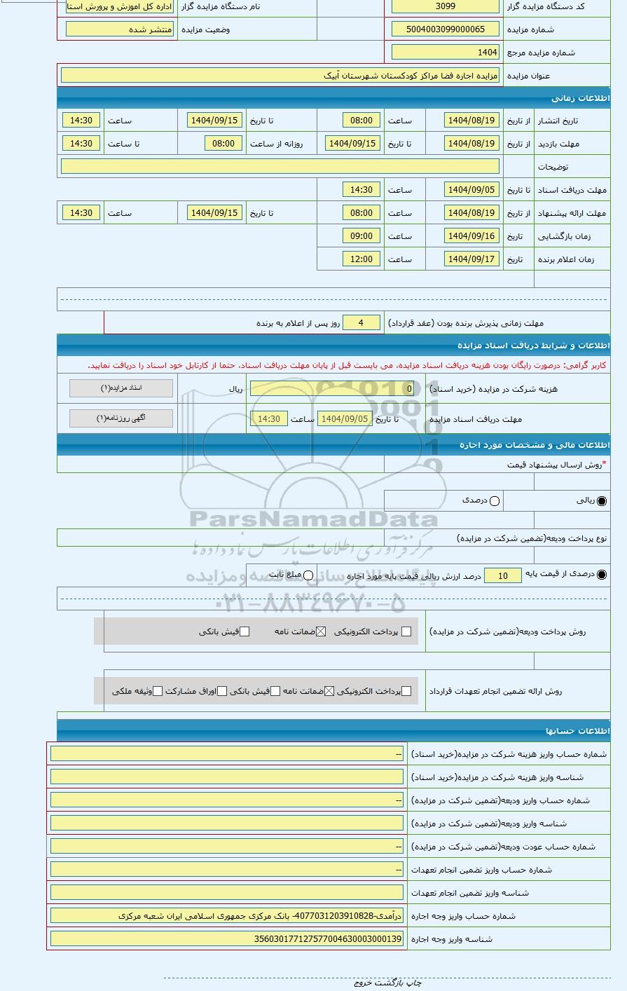 مزایده عمومی مزایده مزایده اجاره فضا مراکز کودکستان شهرستان آبیک برگزار میگردد. از کلیه افراد متخصص و شرکت‌های واجد شرایط دعوت به عمل می‌آید تا در این مزایده با کد خبرگزاری پارس نماد : 9889920 شرکت نمایند تاریخ شروع مزایده : 1404/08/19 مهلت شرکت در مزایده: تا پایان روز 1404/09/05 مکان برگزاری اموال واگذاری استان‌های مزایدات استان قزوین و دسته‌بندی‌های مربوط به این حراجی واگذاری ورزشگاه، پارکینگ، غرفه و بوفه میباشد.
