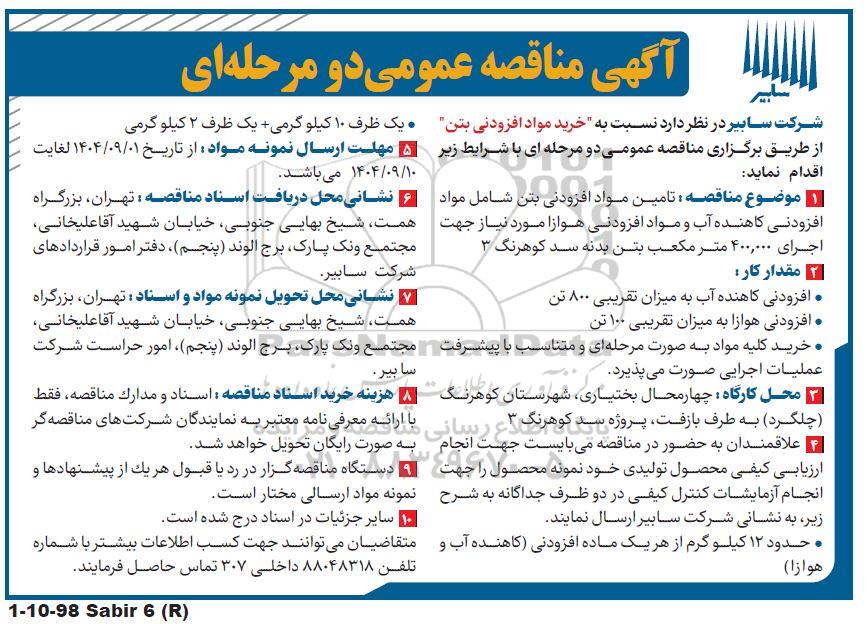 شرکت سابیر در نظر دارد نسبت به "خرید مواد افزودنی بتن" از طریق برگزاری مناقصه عمومی دو مرحله ای با شرایط زیر اقدام نماید: