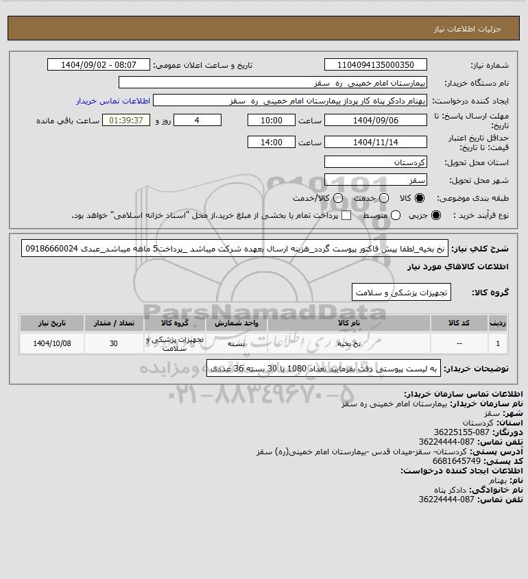 | 1 | -- | نخ بخیه | بسته | تجهیزات پزشکی و سلامت | 30 | 1404/10/08 |