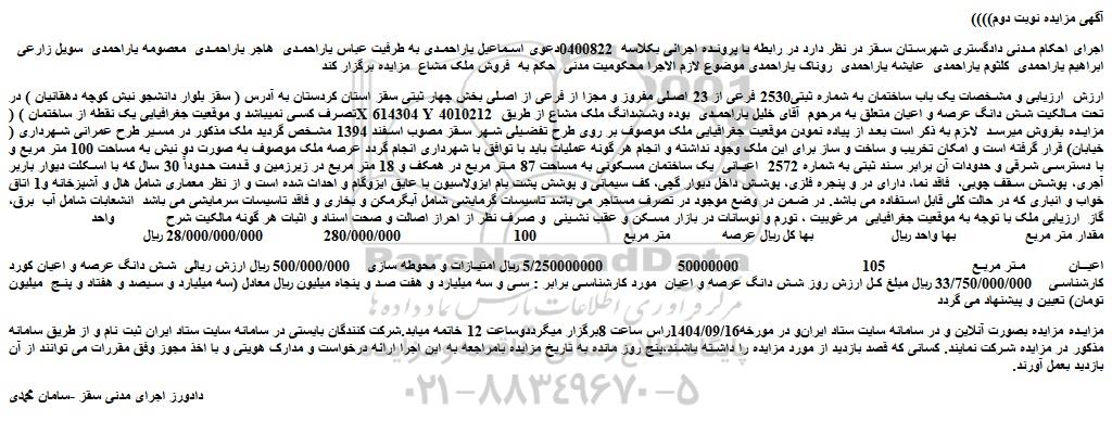 اجرای احکام مدنی دادگستری شهرستان سقز در نظر دارد در رابطه با پرونده اجرائی بکلاسه 0400822دعوی اسماعیل یاراحمدی به طرفیت عباس یاراحمدی هاجر یاراحمدی معصومه یاراحمدی سویل زارعی ابراهیم یاراحمدی کلثوم یاراحمدی عایشه یاراحمدی روناک یاراحمدی موضوع لازم الاجرا محکومیت مدنی حکم به فروش ملک مشاع مزایده برگزار کند