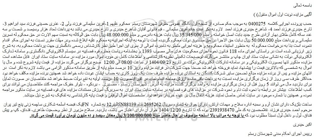 حسب پرونده اجرایی کلاسه 0400275 به موجب حکم صادره از شعبه اول دادگاه عمومی حقوقی شهرستان رستم محکوم علیهم 1-آفرین سلیمانی فرزند ولی 2- عذری حسینی فرزند سید ابراهیم 3- تارخ حیدری فرزند احمد 4- شاهرخ حیدری فرزند احمد لازم به ذکر است خانم آفرین سلیمانی ، قیم قانونی آقایان شاهرخ حیدری و تارخ حیدری می باشد به پرداخت تعداد هزار وسیصد و شصت و سه عدد سکه کامل طلای بهار آزادی طرح جدید بابت اصل خواسته و مبلغ 35/345/000 ریال بابت هزینه دادرسی و مبلغ 48.000.000 ریال بابت حق الوکاله به نسبت سهم الارث در حق محکوم له نسرین سلیمانی و پرداخت مبلغ 50.000.000 ریال بابت حق الاجرا در حق صندوق دولت محکوم گردیده است با توجه به اینکه اجراییه به محکوم علیه ابلاغ شده ودر مهلت مقرر نسبت به اجرای حکم اقدام ننموده است بنا به درخواست محکوم له به منظور استیفاء محکوم به و هزینه اجرایی متعلق به نامبرده اموالی از سوی این اجرا طبق نظر کارشناس رسمی دادگستری جهت پرداخت محکوم به، به شرح زیر ارزیابی شده است در راستای اجرای ماده 118 قانون نحوه اجرای محکومیت های مالی مصوب 1393 و بخشنامه ریاست محترم قوه قضاییه در سیستم الکترونیکی دادگستری و سامانه تدارک الکترونیکی دولت به نشانی سایت ستاد ایران چاپ و منتشر می گردد توضیحات تکمیلی نظریه کارشناسی و اطلاعات کامل در مورد اموال مورد مزایده در سامانه سایت ستاد ایران قابل مشاهده است مزایده مذکور تنها بصورت الکترونیکی و در سامانه تدارکات الکترونیکی دولت در تاریخ 1404/09/23 از ساعت 08:00 الی 12:00 صبح برگزار می گردد مزایده از قیمت پایه شروع شده و مال یا اموال به شخصی که بالاترین قیمت را پیشنهاد نماید فروخته خواهد شد ضمنا جهت شرکت در فرایند مزایده واریز 10 درصد مبلغ پایه از طریق سامانه مذکور الزامی می باشد لازم به ذکر است در انتهای مزایده و پس از برنده مزایده مبالغ تضمین سایر شرکت کنندگان به استثنای برنده مزایده ظرف مدت یک روز کاری به حساب ایشان عودت داده خواهد شد همچنین برنده مزایده مکلف خواهد بود حداکثر ظرف سی روز از زمان برگزاری مزایده نسبت به پرداخت باقی مانده ارزش معامله اقدام نماید در غیر اینصورت 10 درصد اولیه به نفع دولت ضبط خواهد شد متقاضیان در صورت تمایل برای بازدید مال می توانند 5 روز قبل از زمان برگزاری مزایده به واحد برگزار کننده مزایده به آدرس : شهرستان رستم - مصیری - بردکوه - بلوار خفرک مراجعه کنند متقاضیان می توانند برای کسب اطلاعات بیشتر در رابطه با نحوه ثبت نام و نحوه شرکت در مزایده های قوه قضاییه در سامانه سایت ستاد ایران به سربرگ آموزش مستندات مزایده های قوه قضاییه در سایت مذکور مراجعه نموده و همچنین با شماره موجود در سایت تماس حاصل نمایند هزینه انتقال مال بر عهده خریدار خواهد بود. مشخصات اموال توقیفی و قیمت پایه کارشناسی به تفکیک به شرح ذیل میباشد.