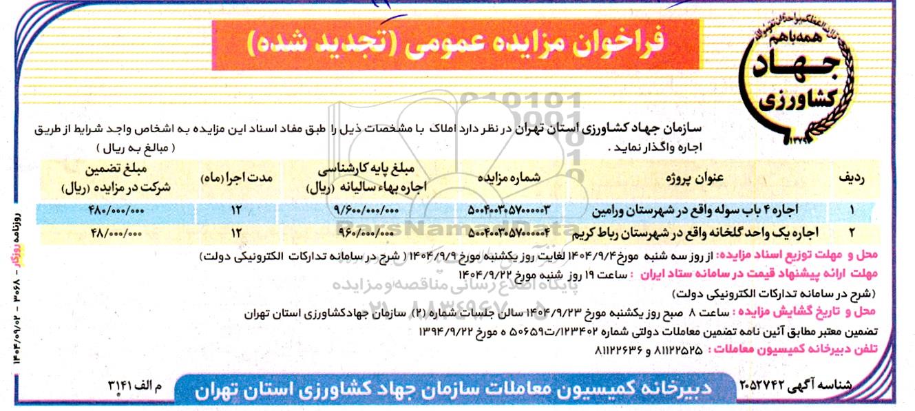 سازمان جهاد کشاورزی استان تهران در نظر دارد املاک با مشخصات ذیل را طبق مفاد اسناد این مزایده به اشخاص واجد شرایط از طریق