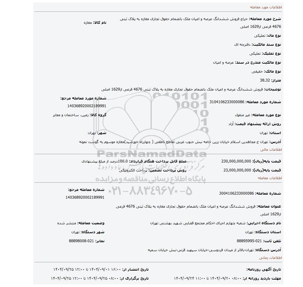 | قیمت پایه(ریال): 23,000,000,000 | روش پرداخت تضمین: پرداخت الکترونیکی |
