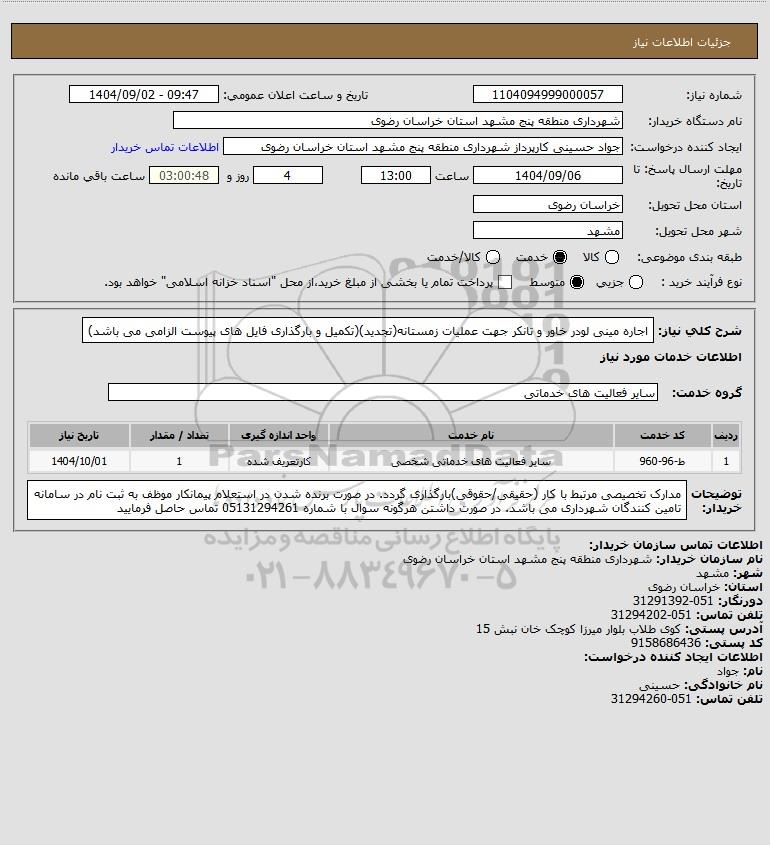 شرح کلی نیاز: اجاره مینی لودر خاور و تانکر جهت عملیات زمستانه(تجدید)(تکمیل و بارگذاری فایل های پیوست الزامی می باشد)