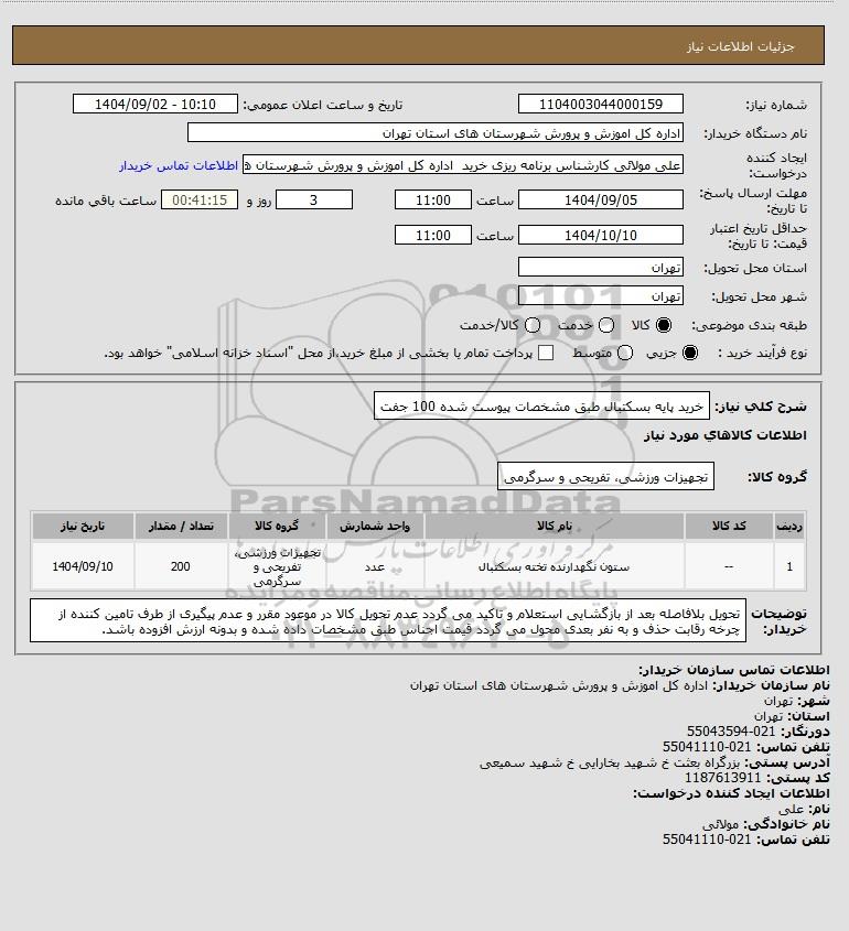 شرح کلی نیاز: خرید پایه بسکتبال طبق مشخصات پیوست شده 100 جفت