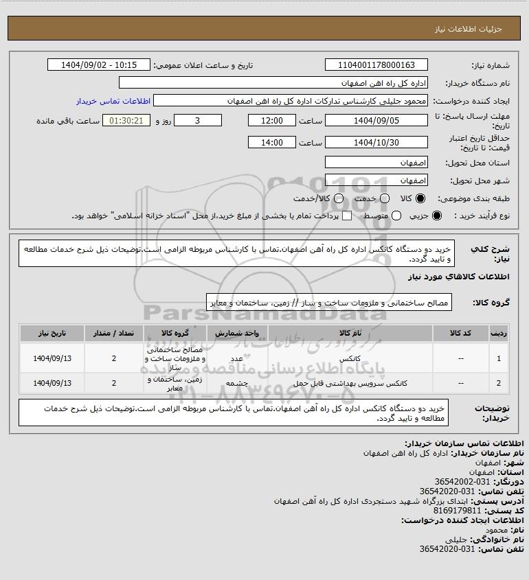 استعلام خرید دو دستگاه کانکس اداره کل راه آهن اصفهان.تماس با کارشناس مربوطه الزامی است.توضیحات ذیل شرح خدمات مطالعه و تایید گردد., استعلام خرید دو دستگاه کانکس اداره کل راه آهن اصفهان.تماس با کارشناس مربوطه الزامی است.توضیحات ذیل شرح خدمات مطالعه و تایید گردد.
