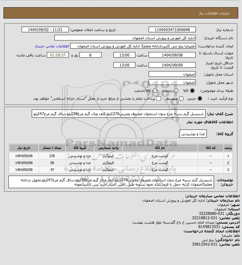 استعلام شنیسل گرم سینه مرغ بدون استخوان غضروف وچربی276کیلو-کتف وبال گرم مرغ58کیلو-ساق گرم مرغ47کیلو, استعلام شنیسل گرم سینه مرغ بدون استخوان غضروف وچربی276کیلو-کتف وبال گرم مرغ58کیلو-ساق گرم مرغ47کیلو