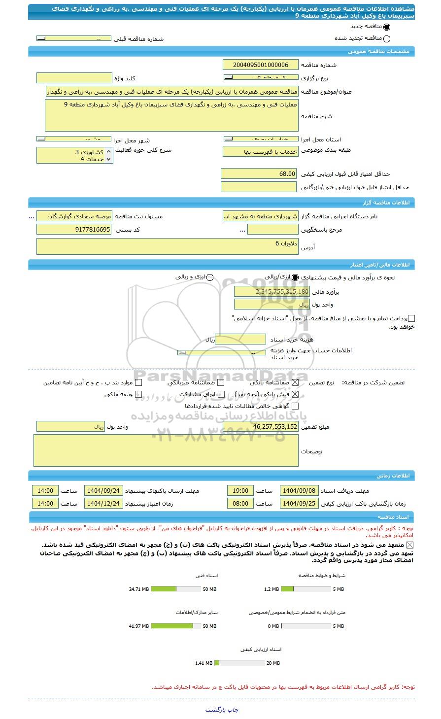| عنوان/موضوع مناقصه | مناقصه عمومی همزمان با ارزیابی (یکپارچه) یک مرحله ای عملیات فنی و مهندسی ،به زراعی و نگهداری فضای سبزپیمان باغ وکیل آباد شهرداری منطقه 9 | ||