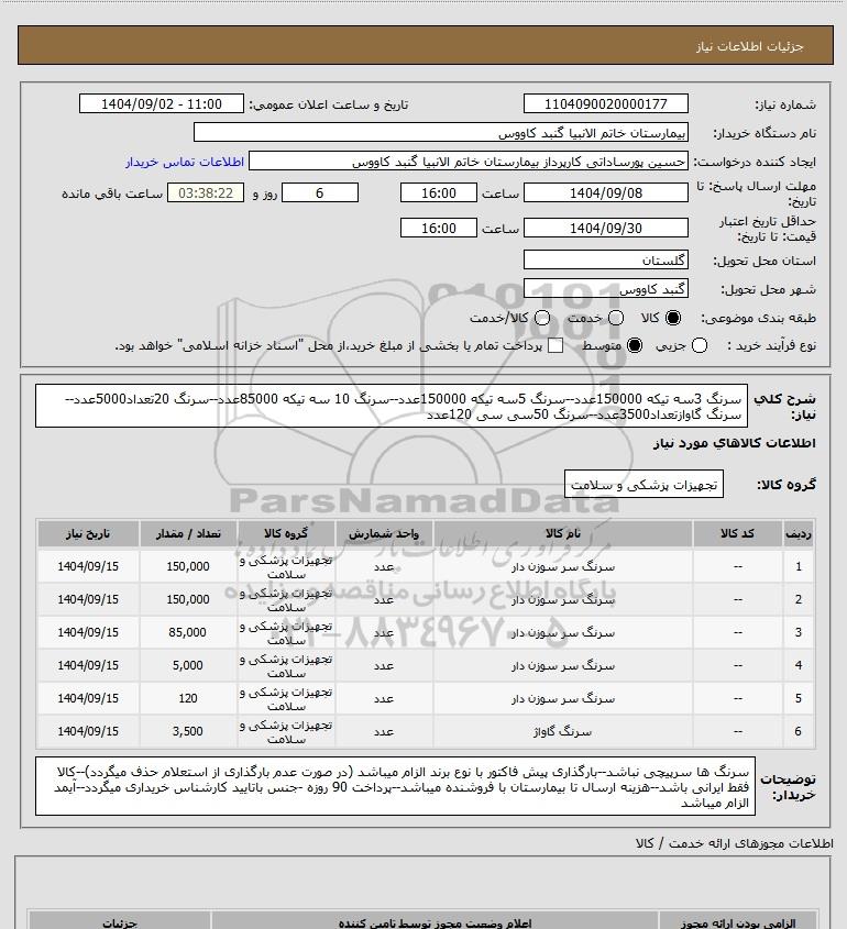 | 2 | -- | سرنگ سر سوزن دار | عدد | تجهیزات پزشکی و سلامت | 150,000 | 1404/09/15 |