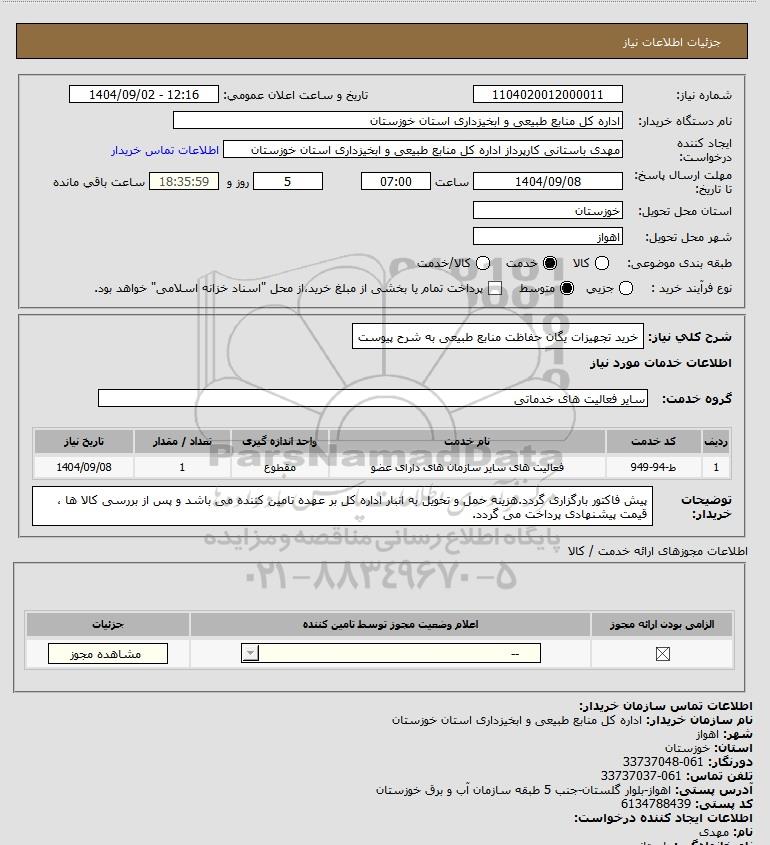 شرح کلی نیاز: خرید تجهیزات یگان حفاظت منابع طبیعی به شرح پیوست