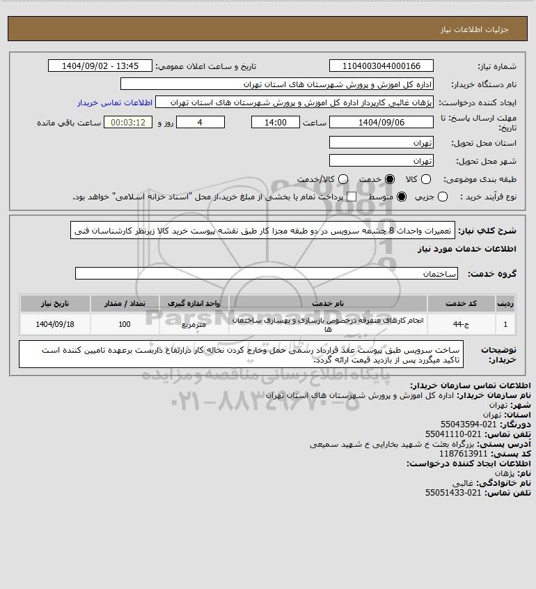 شرح کلی نیاز: تعمیرات واحداث 8 چشمه سرویس در دو طبقه مجزا کار طبق نقشه پیوست خرید کالا زیرنظر کارشناسان فنی