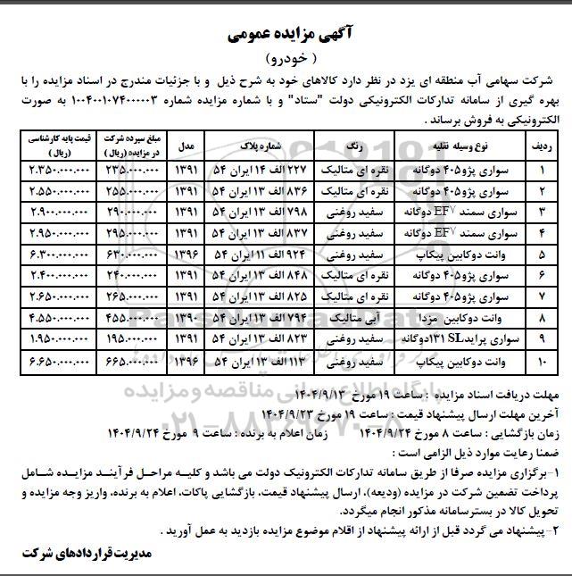 شرکت سهامی آب منطقه ای یزد در نظر دارد کالاهای خود به شرح ذیل و با جزئیات مندرج در اسناد مزایده را با بهره گیری از سامانه تدارکات الکترونیکی دولت ستاد و با شماره مزایده شماره 1004001074000003 به صورت الکترونیکی به فروش برساند .
