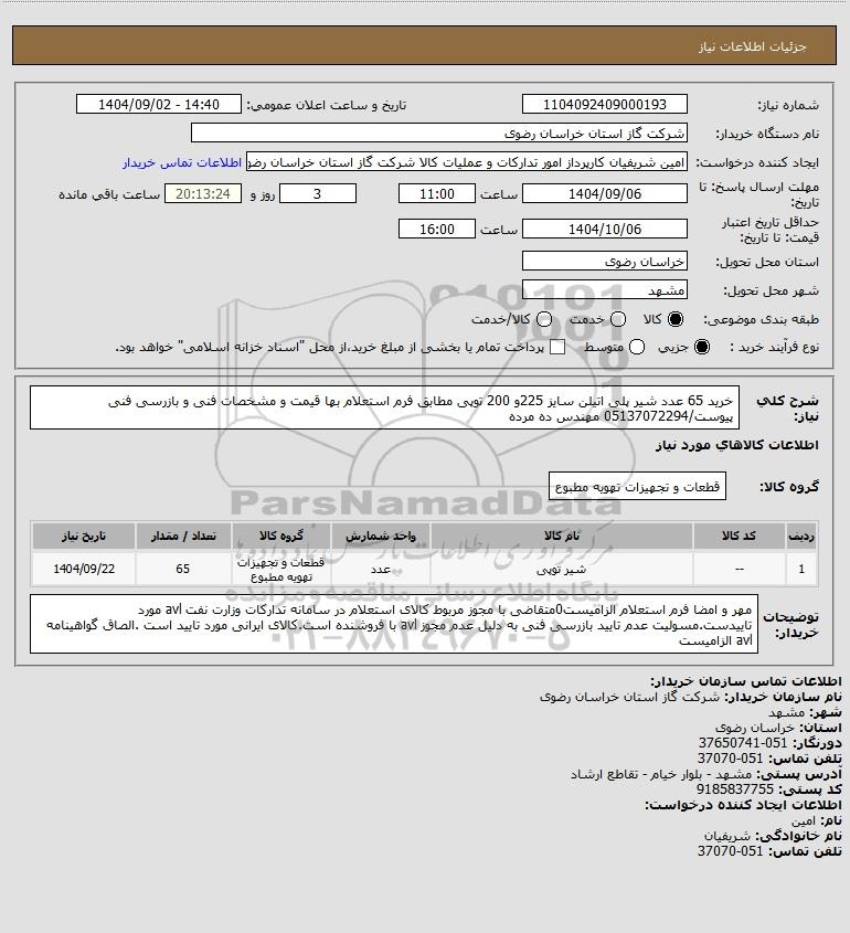نام دستگاه خریدار:شرکت گاز استان خراسان رضوی