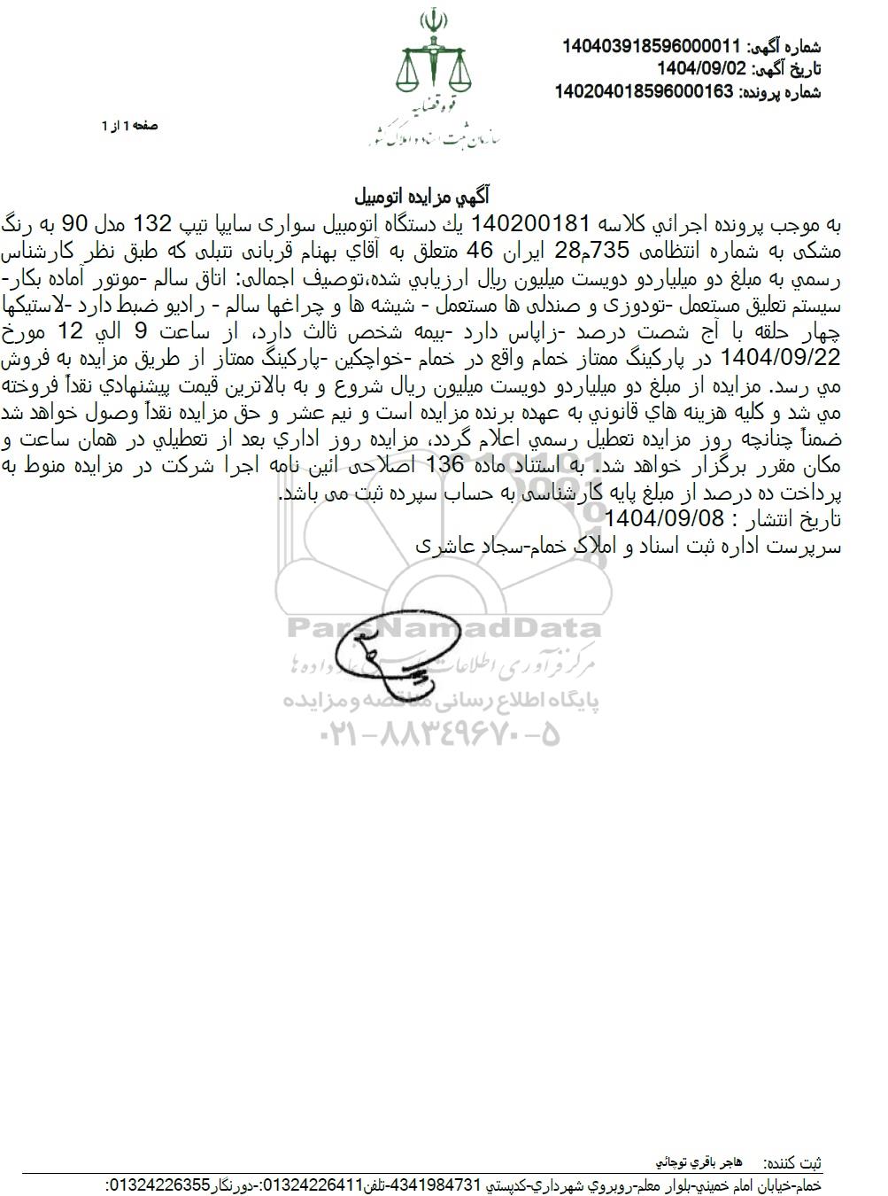 به موجب پرونده اجرائی كلاسه 140200181 یک دستگاه اتومبیل سواری سایپا تیپ 132 مدل 90 به رنگ مشکی به شماره انتظامی 735 28 ایران 46 متعلق به آقای بهنام قربانی نتبلی که طبق نظر کارشناس رسمی به مبلغ دو میلیارد و دویست میلیون ریال ارزیابی شده توصیف اجمالی اتاق سالم موتور آماده بکار سیستم تعلیق مستعمل تودوزی و صندلی ها مستعمل - شیشه ها و چراغها سالم - رادیو ضبط دارد - لاستیکها چهار حلقه با آج شصت درصد زاپاس دارد بیمه شخص ثالث دارد از ساعت 9 الی 12 مورخ 1404.09.22 در پارکینگ ممتاز حمام واقع در خمام خواچکین - پارکینگ ممتاز از طریق مزایده به فروش می رسد. مزایده از مبلغ دو میلیارد و دویست میلیون ریال شروع و به بالاترین قیمت پیشنهادی نقدا فروخته می شد و کلیه هزینه های قانونی به عهده برنده مزایده است و نیم عشر و حق مزایده نقداً وصول خواهد شد. ضمنا چنانچه روز مزایده تعطیل رسمی اعلام گردد مزایده روز اداری بعد از تعطیلی در همان ساعت و مکان مقرر برگزار خواهد شد به استناد ماده 136 اصلاحی آئین نامه اجرا شرکت در مزایده منوط به