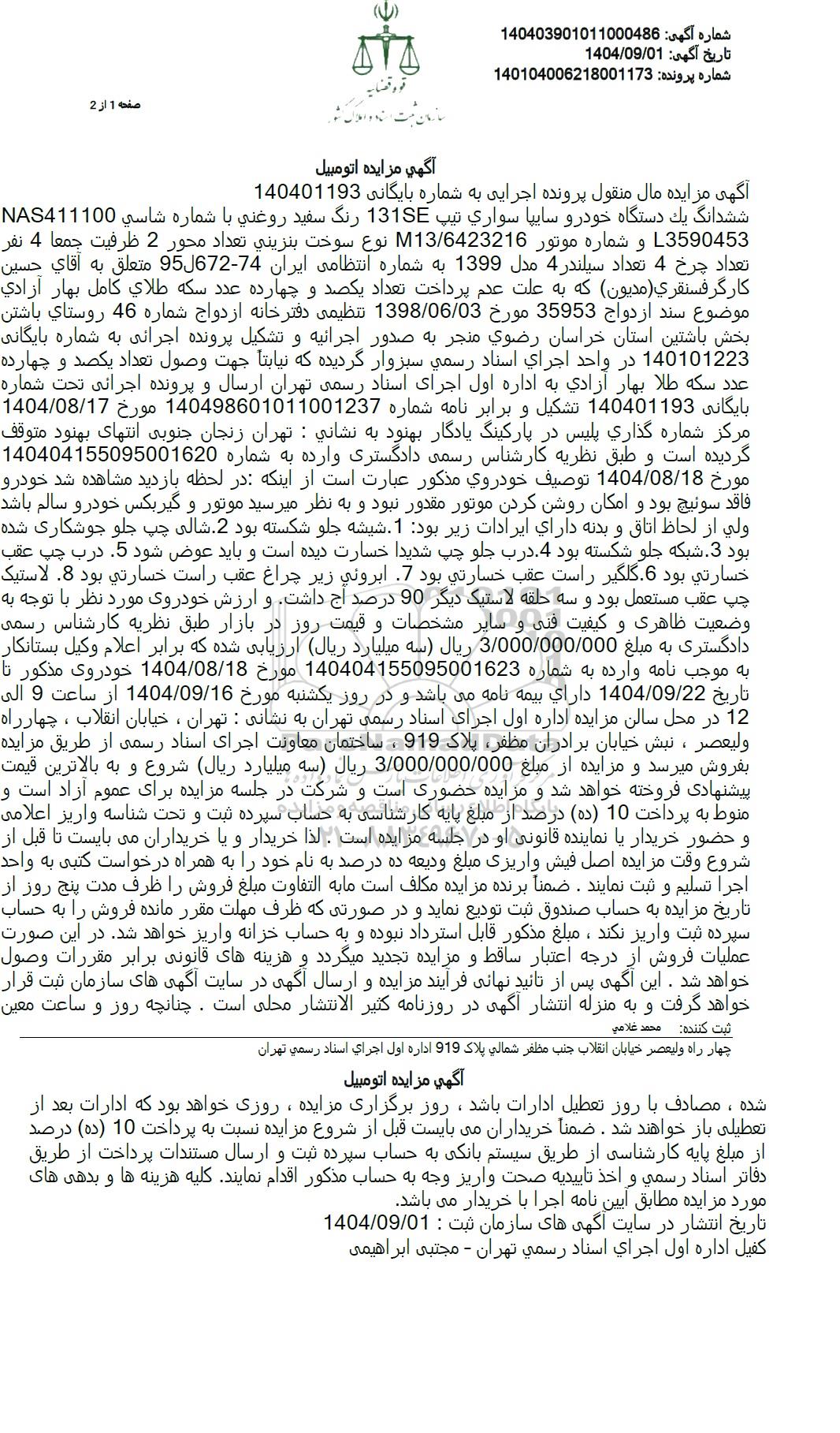 ششدانگ یک دستگاه خودرو سایپا سواری تیپ 131SE رنگ سفید روغنی با شماره شاسی NAS411100 L3590453 و شماره موتور M13.6423216 نوع سوخت بنزینی تعداد محور 2 ظرفیت جمعا 4 نفر تعداد چرخ 4 تعداد سیلندر 4 مدل 1399 به شماره انتظامی ایران 74-95672 متعلق به آقای حسین کارگر فسنقری (مدیون که به علت عدم پرداخت تعداد یکصد و چهارده عدد سکه طلای کامل بهار آزادی موضوع سند ازدواج 35953 مورخ 1398.06.03 تنظیمی دفترخانه ازدواج شماره 46 روستای باشتن بخش باشتین استان خراسان رضوی منجر به صدور اجرائیه و تشکیل پرونده اجرائی به شماره بایگانی 140101223 در واحد اجرای اسناد رسمی سبزوار گردیده که نیابتاً جهت وصول تعداد یکصد و چهارده عدد سکه طلا بهار آزادی به اداره اول اجرای اسناد رسمی تهران ارسال و پرونده اجرائی تحت شماره 1404.08.17 بایگانی 140401193 تشکیل و برابر نامه شماره 140498601011001237 مورخ مرکز شماره گذاری پلیس در پارکینگ یادگار بهنود به نشانی : تهران زنجان جنوبی انتهای بهنود متوقف گردیده است و طبق نظریه کارشناس رسمی دادگستری وارده به شماره 140404155095001620 مورخ 1404.08.18 توصیف خودروی مذکور عبارت است از اینکه در لحظه بازدید مشاهده شد خودرو فاقد سوئیچ بود و امکان روشن کردن موتور مقدور نبود و به نظر میرسید موتور و گیربکس خودرو سالم باشد. ولی از لحاظ اتاق و بدنه دارای ایرادات زیر بود: .1 شیشه جلو شکسته بود .2 شالی چپ جلو جوشکاری شده بود .3 شبکه جلو شکسته بود . 4 درب جلو چپ شدیدا خسارت دیده است و باید عوض شود 5 درب چپ عقب خسارتی بود 6 گلگیر راست عقب خسارتی بود .7 ابرونی زیر چراغ عقب راست خسارتی بود 8 لاستیک چپ عقب مستعمل بود و سه حلقه لاستیک دیگر 90 درصد آج داشت و ارزش خودروی مورد نظر با توجه به وضعیت ظاهری و کیفیت فنی و سایر مشخصات و قیمت روز در بازار طبق نظریه کارشناس رسمی دادگستری به مبلغ 3.000.000.000 ریال سه میلیارد ریال ارزیابی شده که برابر اعلام وکیل بستانکار به موجب نامه وارده به شماره 140404155095001623 مورخ 1404.08.18 خودروی مذکور تا تاریخ 1404.09.22 دارای بیمه نامه می باشد و در روز یکشنبه مورخ 1404.09.16 از ساعت 9 الی 12 در محل سالن مزایده اداره اول اجرای اسناد رسمی تهران به نشانی : تهران، خیابان انقلاب ، چهارراه ولیعصر ، نبش خیابان برادران مظفر پلاک 919 ، ساختمان معاونت اجرای اسناد رسمی از طریق مزایده بفروش میرسد و مزایده از مبلغ 3.000.000.000 ریال سه میلیارد ریال شروع و به بالاترین قیمت پیشنهادی فروخته خواهد شد و مزایده حضوری است و شرکت در جلسه مزایده برای عموم آزاد است و منوط به پرداخت 10 (ده) درصد از مبلغ پایه کارشناسی به حساب سپرده ثبت و تحت شناسه واریز اعلامی و حضور خریدار یا نماینده قانونی او در جلسه مزایده است. لذا خریدار و یا خریداران می بایست تا قبل از شروع وقت مزایده اصل فیش واریزی مبلغ ودیعه ده درصد به نام خود را به همراه درخواست کتبی به واحد اجرا تسلیم و ثبت نمایند، ضمنا برنده مزایده مکلف است ما به التفاوت مبلغ فروش را ظرف مدت پنج روز از تاریخ مزایده به حساب صندوق ثبت تودیع نماید و در صورتی که ظرف مهلت مقرر مانده فروش را به حساب سپرده ثبت واریز نکند ، مبلغ مذکور قابل استرداد نبوده و به حساب خزانه واریز خواهد شد. در این صورت عملیات فروش از درجه اعتبار ساقط و مزایده تجدید میگردد و هزینه های قانونی برابر مقررات وصول خواهد شد. این آگهی پس از تایید نهایی فرایند مزایده و ارسال آگهی در سایت آگهی های سازمان ثبت قرار خواهد گرفت و به منزله انتشار آگهی در روزنامه کثیر الانتشار محلی است. چنانچه روز و ساعت معینشده ، مصادف با روز تعطیل ادارات باشد، روز برگزاری مزایده، روزی خواهد بود که ادارات بعد از تعطیلی باز خواهند شد. ضمناً خریداران می بایست قبل از شروع مزایده نسبت به پرداخت 10 (ده) درصد از مبلغ پایه کارشناسی از طریق سیستم بانکی به حساب سپرده ثبت و ارسال مستندات پرداخت از طریق دفاتر اسناد رسمی و اخذ تاییدیه صحت واریز وجه به حساب مذکور اقدام نمایند. کلیه هزینه ها و بدهی های مورد مزایده مطابق آیین نامه اجرا با خریدار 