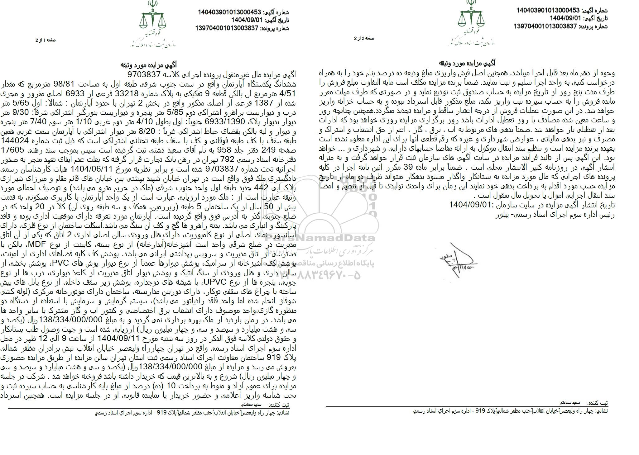 آگهی مزایده مال غیر منقول پرونده اجرائی کلاسه 9703837 ششدانگ یکدستگاه آپارتمان واقع در سمت جنوب شرقی طبقه اول به مساحت 98.81 متر مربع که مقدار 4.51 متر مربع آن بالكن قطعه 9 تفکیکی به پلاک شماره 33218 فرعی از 6933 اصلی مفروز و مجزی شده از 1387 فرعی از اصلی مذکور واقع در بخش 2 تهران با حدود آپارتمان : شمالا: اول 5.65 متر درب و دیواریست براهرو اشتراکی دوم 5.85 متر پنجره و دیواریست بنورگیر اشتراکی شرقا 9.30 متر دیوار بدیوار پلاک 6933.1390 جنوباً : اول بطول 4.10 متر دوم غربی 1.10 متر سوم 7.40 متر پنجره و دیوار و لبه بالكن بفضای حیاط اشتراکی غرباً : 8.20 متر دیوار اشتراکی با آپارتمان سمت غربی همین طبقه سقف با کف طبقه فوقانی و کف با سقف طبقه تحتانی اشتراکی است که ذیل ثبت شماره 144024 صفحه 249 دفتر جلد 958 به نام آقای سعید دشتی ثبت گردیده است سپس بموجب سند رهنی 17605 دفترخانه اسناد رسمی 792 تهران در رهن بانک تجارت قرار گرفته که بعلت عدم ایفای تعهد منجر به صدور اجرائیه تحت شماره 9703837 شده است و برابر نظریه مورخ 1404.06.11 هیات کارشناسان رسمی دادگستری ملک فوق واقع است در تهران خیابان شهید بهشتی بین خیابانهای قائم مقام و میرزای شیرازی پلاک آبی 442 جدید طبقه اول واحد جنوب شرقی ملک در حریم مترو میباشد و توصیف اجمالی مورد وثیقه عبارت است از: ملک مورد ارزیابی عبارت است از یک واحد آپارتمان با کاربری مسکونی به قدمت بیش از 50 سال از یک ساختمان 5 طبقه زیرزمین همکف و سه طبقه روی آن کلا در 20 واحد که در ضلع جنوبی گذر به آدرس فوق واقع گردیده است. آپارتمان مورد تعرفه دارای موقعیت اداری بوده و فاقد پارکینگ و انباری می باشد. بدنه راهروها گچ و کف آن سنگ می باشد. اسکلت ساختمان از نوع فلزی دارای آسانسور نمای اصلی از نوع کامپوزیت دارای هال ورودی سالن اصلی اداری 2 اتاق که یکی از آن اتاق مدیریت در ضلع شرقی واحد است آشپزخانه آبدارخانه از نوع بسته کابینت از نوع MDF بالکن با دسترسی از اتاق مدیریت و سرویس بهداشتی ایرانی میباشد پوشش کف کلیه فضاهای اداری از لمینت پوشش کف آشپزخانه از سرامیک پوشش دیوارها عمدتاً از نوع دیوار پوش های PVC پوشش بخشی از سالن اداری و هال ورودی از سنگ آنتیک و پوشش دیوار اتاق مدیریت از کاغذ دیواری درب ها از نوع چوبی پنجره ها از نوع UPVC با شیشه های دو جداره پوشش زیر سقف داخلی از نوع پانل های پیش ساخته با چراغ های سقفی توکار دارای دوربین مدار بسته ساختمان دارای موتورخانه مرکزی لوله کشی شوفاژ انجام شده اما واحد فاقد رادیاتور میباشد سیستم گرمایش و سرمایش با استفاده از دستگاه دو منظوره گازی واحد موصوف دارای انشعاب برق اختصاصی و کنتور آب و گاز مشترک با سایر واحد ها می باشد. در زمان بازدید از ملک بهره برداری نمی گردید و به مبلغ 138.334.000.000 ریال یکصد و سی و هشت میلیارد و سیصد و سی و چهار میلیون ریال ارزیابی شده است و جهت وصول طلب بستانکار و حقوق دولتی کلاسه فوق الذکر در روز سه شنبه مورخ 1404.09.11 از ساعت 9 الی 12 ظهر در محل اداره سوم اجرای اسناد رسمی واقع در تهران چهارراه ولیعصر خیابان انقلاب نبش برادران مظفر شمالی پلاک 919 ساختمان معاونت اجرای اسناد رسمی ثبت استان تهران سالن مزایده از طریق مزایده حضوری بفروش می رسد و مزایده از مبلغ 138.334.000.000 ريال یکصد و سی و هشت میلیارد و سیصد و سی و چهار میلیون ریال شروع و به بالاترین قیمت که خریدار داشته باشد فروخته خواهد شد . شرکت در جلسه مزایده برای عموم آزاد و منوط به پرداخت 10 (ده) درصد از مبلغ پایه کارشناسی به حساب سپرده ثبت و تحت شناسه واریز اعلامی و حضور خریدار یا نماینده قانونی او در جلسه مزایده است. همچنین استرداد وجوه از دهم ماه بعد قابل اجرا میباشد. همچنین اصل فیش واریزی مبلغ ودیعه ده درصد بنام خود را به همراه درخواست کتبی به واحد اجرا تسلیم و ثبت نمایند. ضمناً برنده مزایده مکلف است ما به التفاوت مبلغ فروش را ظرف مدت پنج روز از تاریخ مزایده به حساب صندوق ثبت تودیع نماید و در صورتی که ظرف مهلت مقرر مانده فروش را به حساب سپرده ثبت واریز نکن