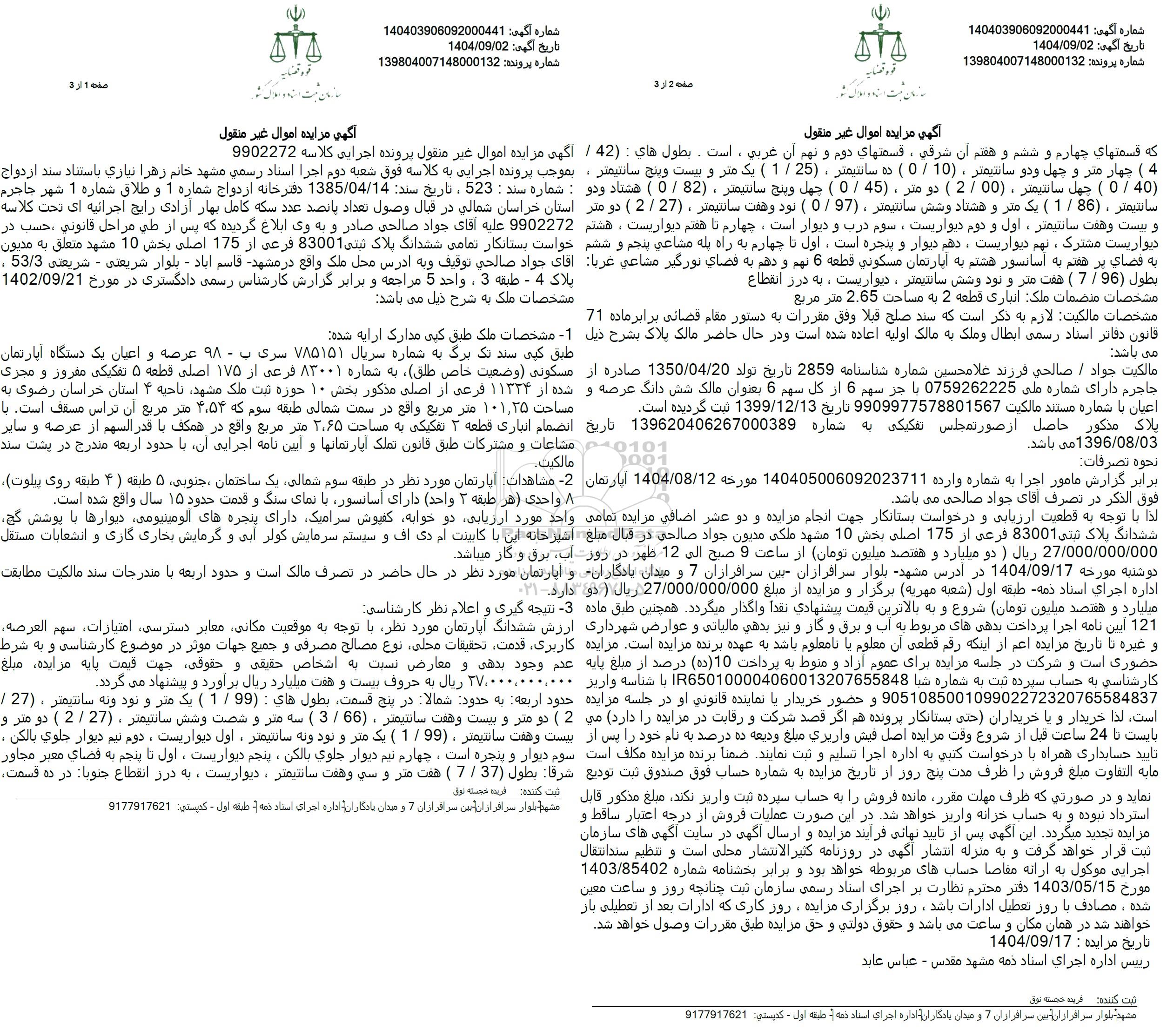 با توجه به قطعیت ارزیابی و درخواست بستانکار جهت انجام مزایده و دو عشر اضافی مزایده تمامی ششدانگ پلاک ثبتی 83001 فرعی از 175 اصلی بخش 10 مشهد ملکی مدیون جواد صالحی در قبال مبلغ 27.000.000.000 ریال ( دو میلیارد و هفتصد میلیون تومان ) از ساعت 9 صبح الی 12 ظهر در روز دوشنبه مورخه 1404.09.17 در آدرس مشهد بلوار سرافرازان مبین سرافرازان 7 و میدان یادگاران اداره اجرای اسناد دمه طبقه اول (شعبه مهریه) برگزار و مزایده از مبلغ 27.000.000.000 ریال ( دو میلیارد و هفتصد میلیون تومان ) شروع و به بالاترین قیمت پیشنهادی نقداً واگذار میگردد.