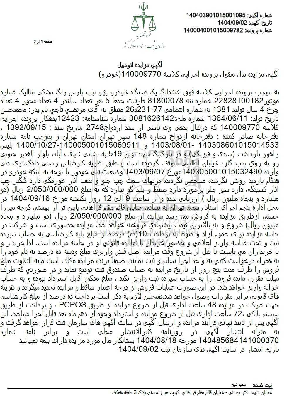آگهی مزایده مال منقول پرونده اجرایی کلاسه 140009770 (خودرو)