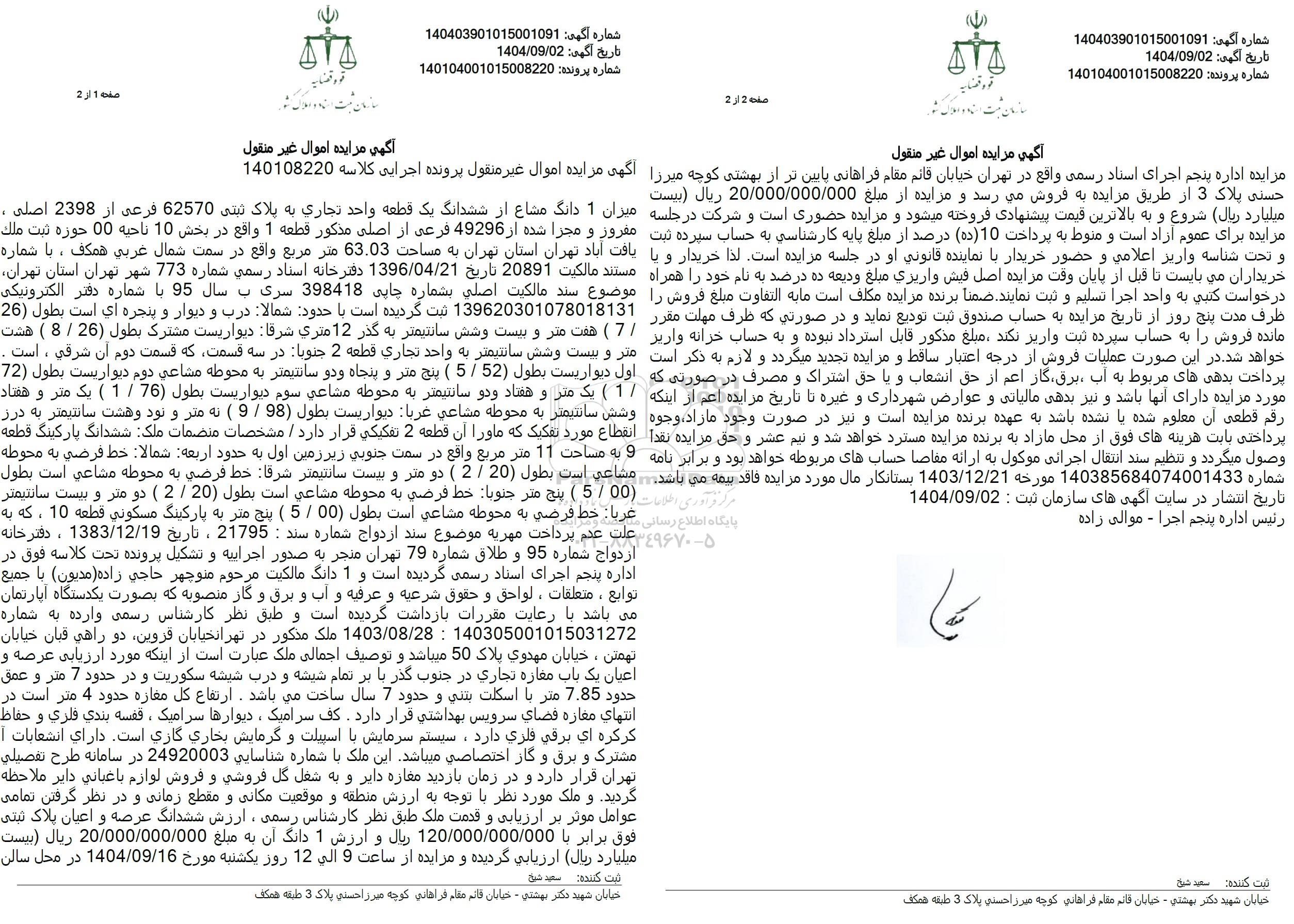 آگهی مزایده اموال غیر منقول پرونده اجرایی کلاسه 140108220