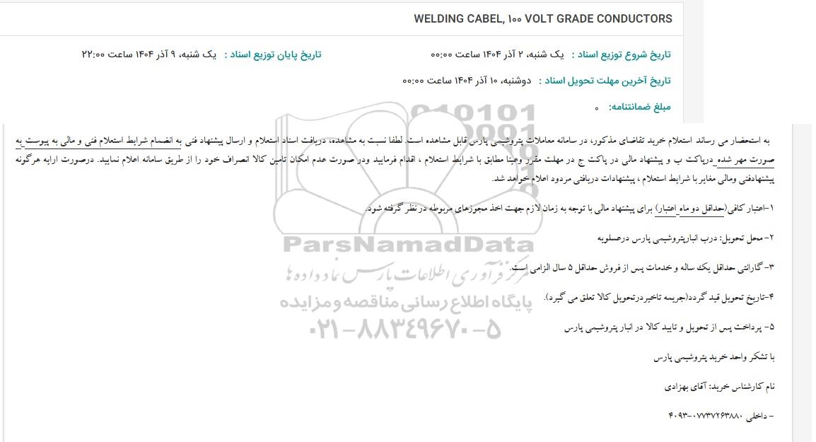 استعلام بها و موضوع استعلام استعلام WELDING CABLE 100 VOLT GRADE CONDUCTORS به اطلاع کلیه شرکتها و افراد متخصص واجد شرایط میرساند، آگهی گذار در نظر دارد از طریق استعلام بها، نسبت به انتخاب و دریافت پیشنهادات اقدام نماید. این استعلام با کد آگهی ثبت شده در سامانه خبرگزاری پارس نماد : 9894590 منتشر شده است. مشخصات استعلام : تاریخ شروع استعلام: 1404/09/02 آخرین مهلت ارسال پیشنهاد قیمت : 1404/09/09 و محل اجرای پروژه : استان مناقصات استان بوشهر میباشد. استعلام قیمت مورد درخواست : استعلام WELDING CABLE 100 VOLT GRADE CONDUCTORS با دستهبندیهای تخصصی و گروه های مرتبط : کمپرسورهای هوا, تجهیزات نفت و گاز, استعلام اطلاع رسانی میگردد.