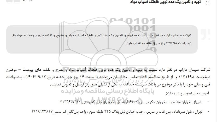 شرکت سیمان داراب در نظر دارد نسبت به تهیه و تامین یک عدد توپی غلطک آسیاب مواد و بشرح و نقشه های پیوست - موضوع درخواست 1121498 و از طریق مناقصه اقدام نماید. متقاضیان میتوانند تا ساعت 14 روز چهار شنبه تاریخ 1404.09.12 ، پیشنهادات فنی و مالی خود را با ذکر موضوع در پاکات سربسته جداگانه به یکی از نشانیهای زیر ارسال و تحویل نمایند.
