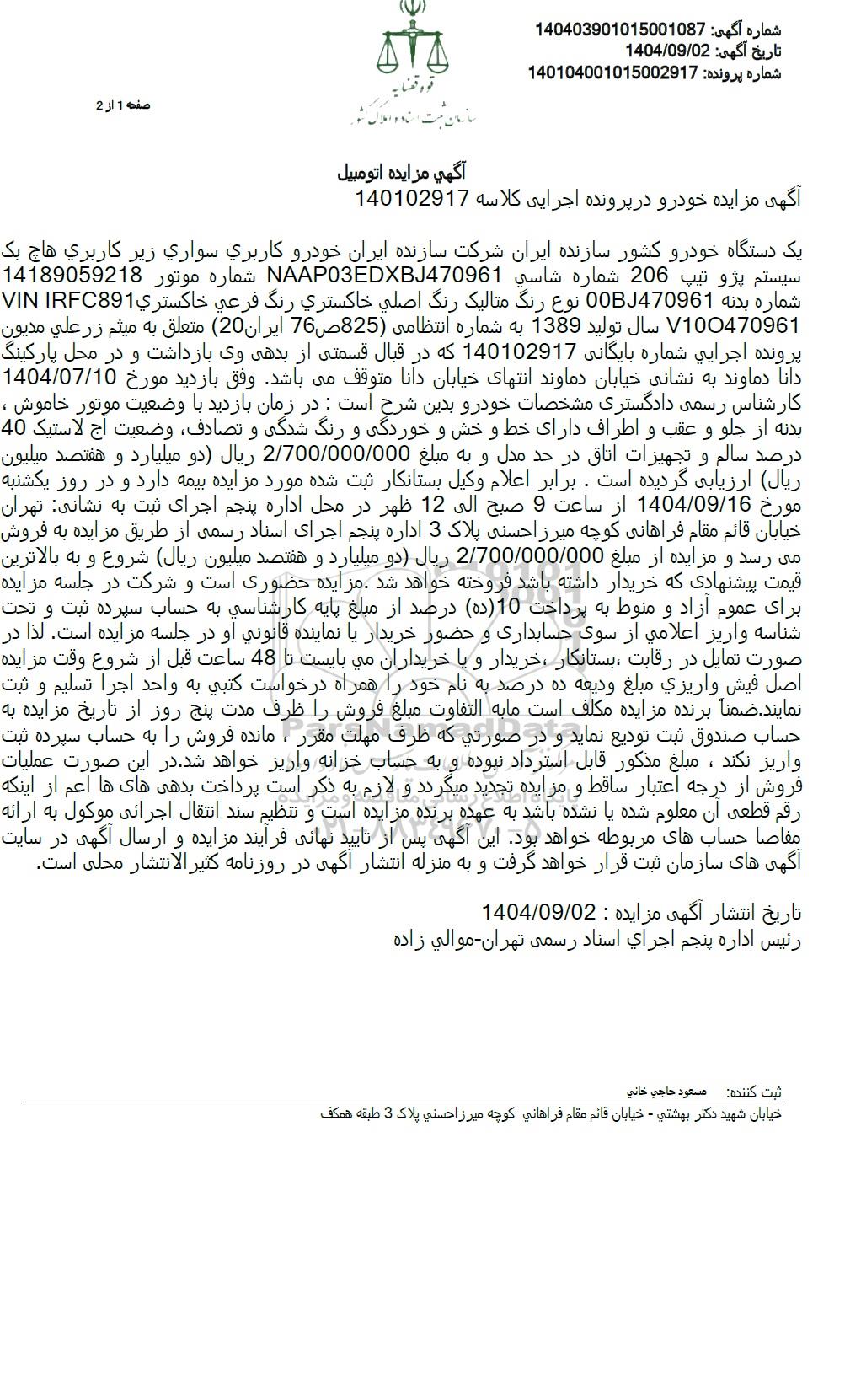 آگهی مزایده خودرو در پرونده اجرایی کلاسه 140102917