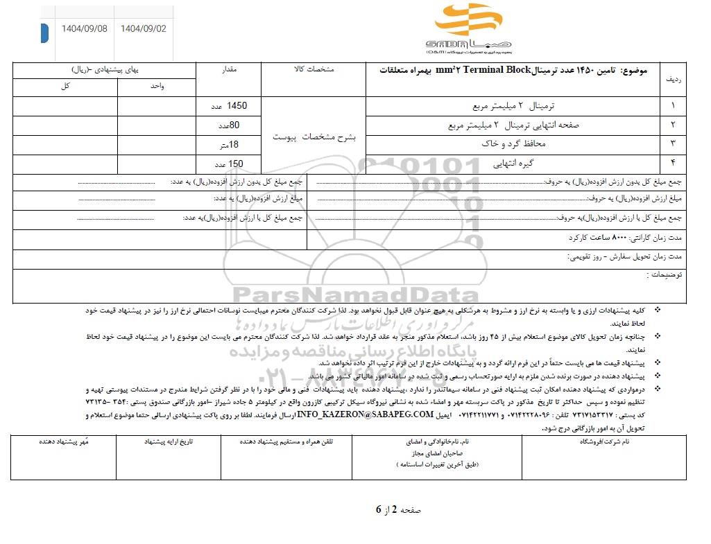 | 1 | تامین 1450 عدد ترمینال MM 02 TERMINAL BLOCK بهمراه متعلقات | بشرح مشخصات پیوست | 1450 عدد |