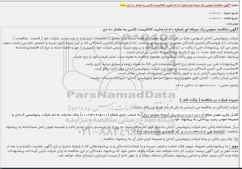 عنوان: آگهی مناقصه عمومی یک مرحله ای شماره 31 - 404 خرید کاتالیست اکسی به مقدار 20 تن