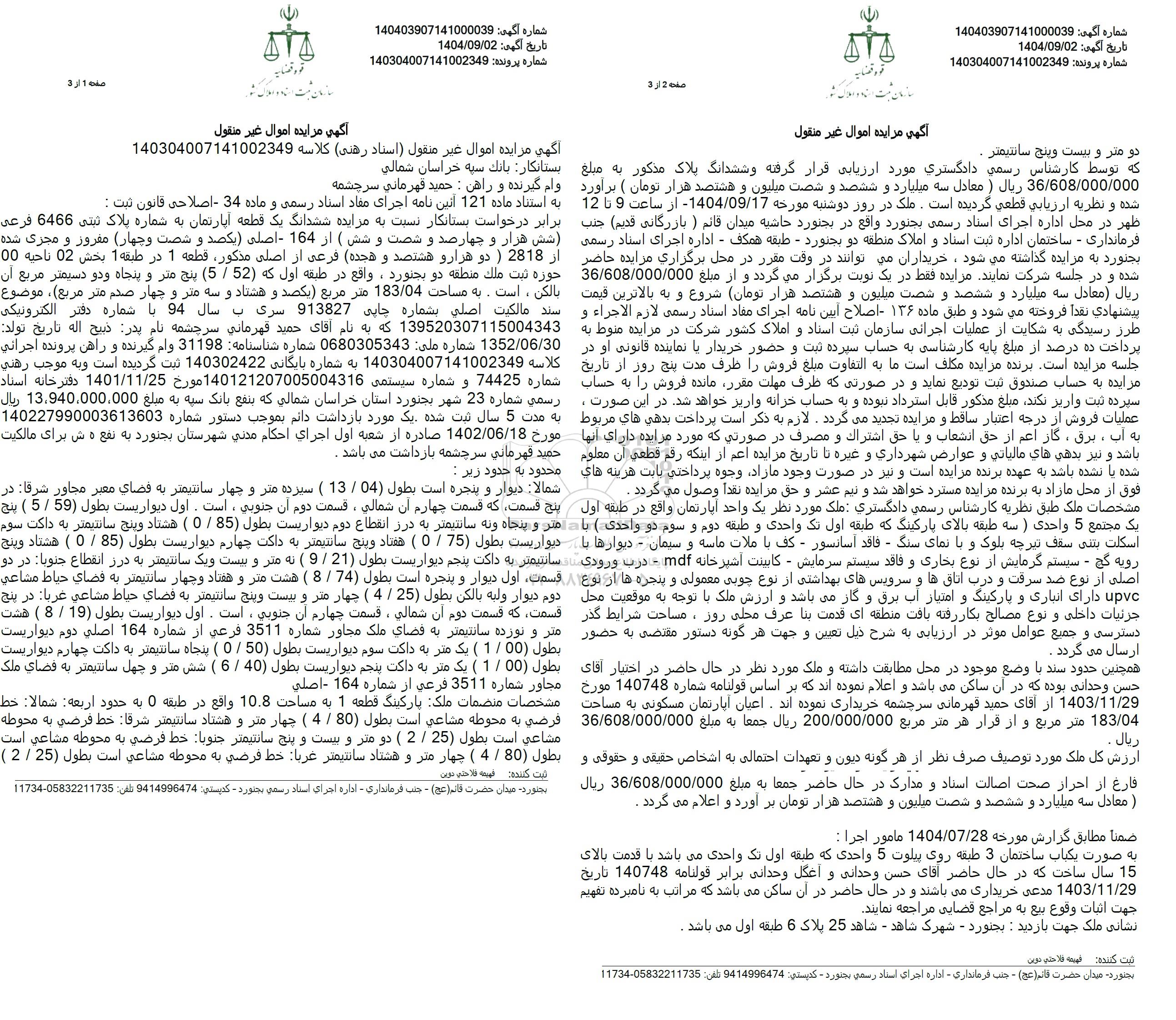برابر درخواست بستانکار نسبت به مزایده ششدانگ یک قطعه آپارتمان به شماره پلاک ثبتی 6466 فرعی (شش هزار و چهارصد و شصت و شش ) از 164 - اصلی (یکصد و شصت و چهار) مفروز و مجری شده از 2818 (دو هزار و هشتصد و هجده) فرعی از اصلی مذکور، قطعه 1 در طبقه 1 بخش 02 ناحیة 00 حوزه ثبت ملک منطقه دو بجنورد، واقع در طبقه اول که توسط کارشناس رسمی دادگستری مورد ارزیابی قرار گرفته و ششدانگ پلاک مذکور به مبلغ 36.608.000.000 ریال ( معادل سه میلیارد و ششصد و شصت میلیون و هشتصد هزار تومان ) برآورد شده و نظریه ارزیابی قطعی گردیده است. ملک در روز دوشنبه مورخه 1404.09.17 - از ساعت 9 تا 12 ظهر در محل اداره اجرای اسناد رسمی بجنورد واقع در بجنورد حاشیه میدان قائم ( بازرگانی قدیم) جنب فرمانداری - ساختمان اداره ثبت اسناد و املاک منطقه دو بجنورد - طبقه همکف - اداره اجرای اسناد رسمی بجنورد به مزایده گذاشته می شود، نشانی ملک جهت بازدید : بجنورد - شهرک شاهد - شاهد 25 پلاک 6 طبقه اول می باشد.