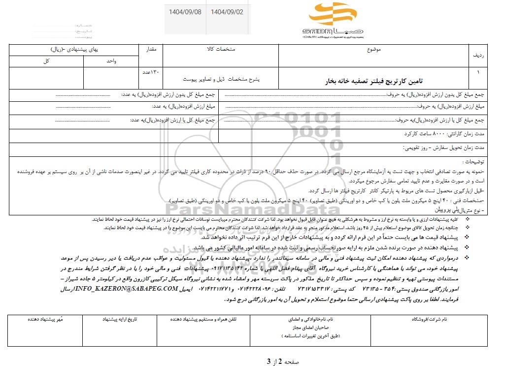 | 1 | تامین کارتریج فیلتر تصفیه خانه بخار | بشرح مشخصات ذیل و طبق لیست پیوست | 130 عدد |