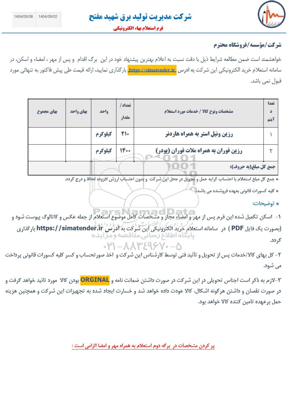 خواهشمند است ضمن مطالعه شرایط ذیل با دقت نسبت به اعلام بهترین پیشنهاد خود در این برگ اقدام و پس از مهر ، امضاء و اسکن در سامانه استعلام خرید الکترونیکی این شرکت به آدرس https://simatender.ir بارگذاری نمایید ارائه قیمت طی پیش فاکتور به تنهایی مورد قبول نمی باشد.