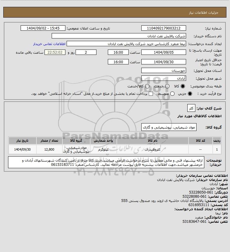 | 1 | -- | کلروهیدرات | کیلوگرم | مواد شیمیایی، بیوشیمیایی و گازی | 12,800 | 1404/09/30 |