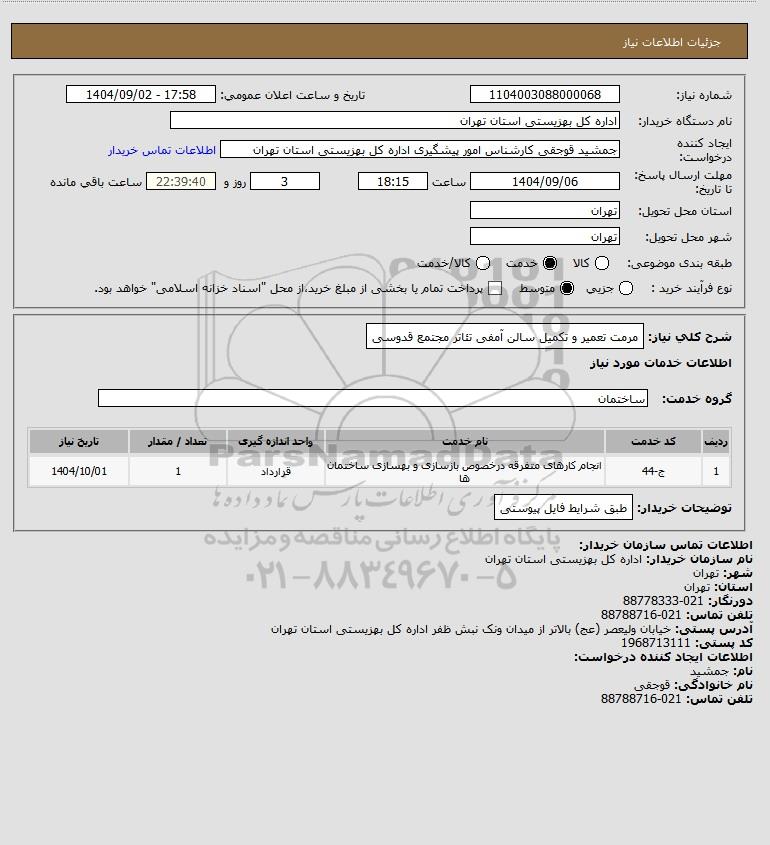 شرح کلی نیاز: مرمت تعمیر و تکمیل سالن آمفی تئاتر مجتمع قدوسی