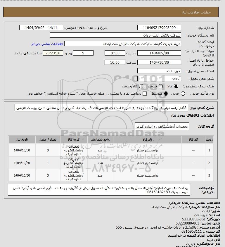 | 3 | -- | ترانسمیتر فشار | عدد | تجهیزات آزمایشگاهی و اندازه گیری | 3 | 1404/10/30 |