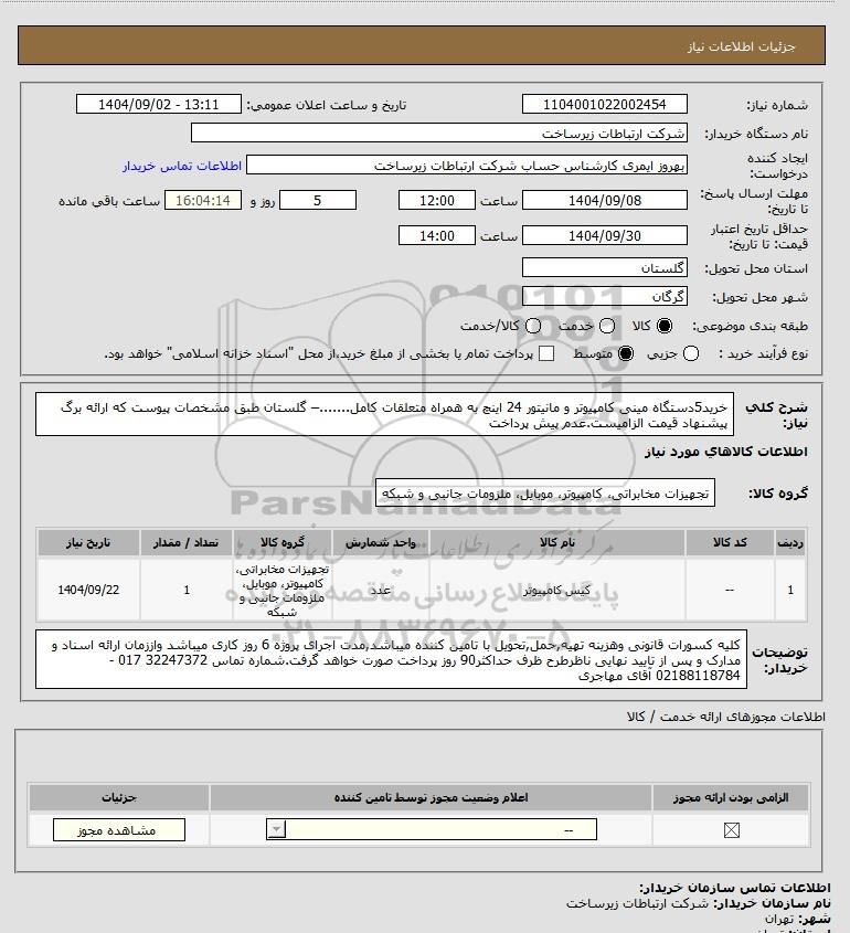 شرح کلی نیاز: خرید5دستگاه مینی کامپیوتر و مانیتور 24 اینچ به همراه متعلقات کامل.......– گلستان طبق مشخصات پیوست که ارائه برگ پیشنهاد قیمت الزامیست.عدم پیش پرداخت