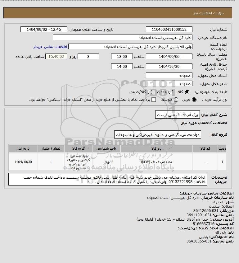شرح کلی نیاز: ورق ام دی اف طبق لیست