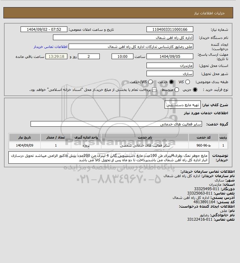 توضیحات خریدار:مایع جوهر نمک بطری4لیتری من 100عدد مایع دستشویی گالن 4 لیتری من 200عدد پیش فاکتور الزامی میباشد تحویل درساری انبار اداره کل راه آهن شمال می باشدپرداخت تا دو ماه پس از تحویل کالا می باشد