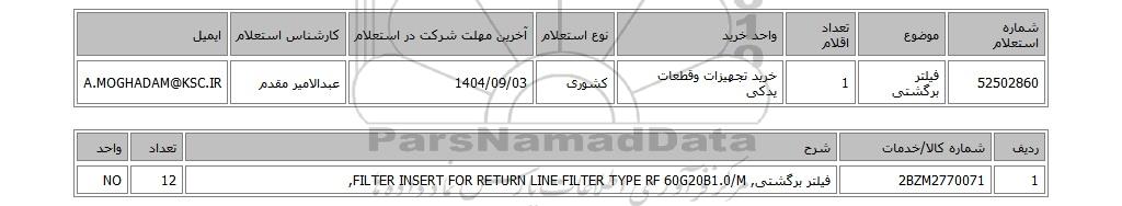 | 52502860 | فیلتر برگشتی | 1 | خرید تجهیزات وقطعات یدکی | کشوری | 1404/09/03 | عبدالامیر مقدم | A.MOGHADAM@KSC.IR |