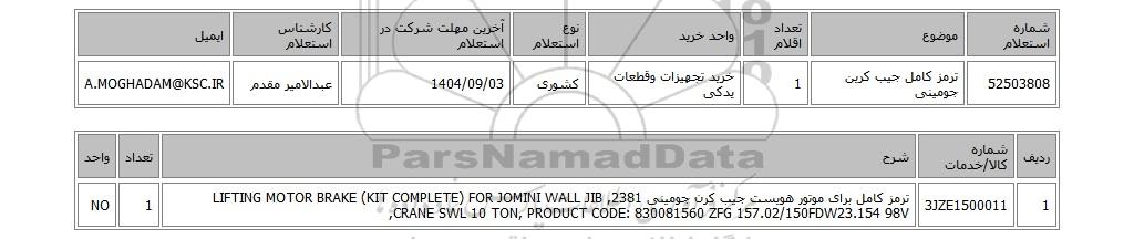 | 52503808 | ترمز کامل جیب کرین جومینی | 1 | خرید تجهیزات وقطعات یدکی | کشوری | 1404/09/03 | عبدالامیر مقدم | A.MOGHADAM@KSC.IR |