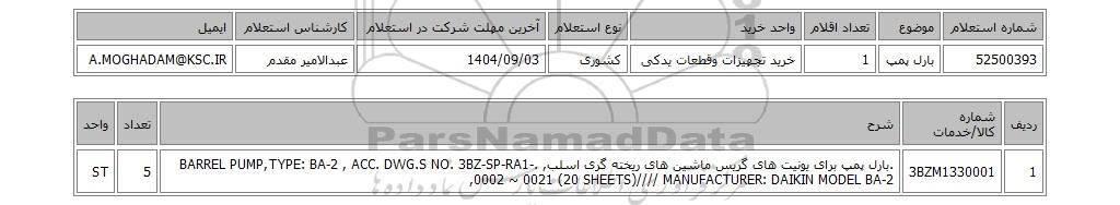 | 52500393 | بارل پمپ | 1 | خرید تجهیزات وقطعات یدکی | کشوری | 1404/09/03 | عبدالامیر مقدم | A.MOGHADAM@KSC.IR |