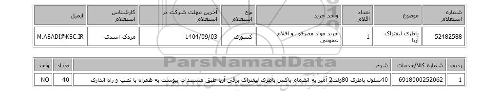 | 52482588 | باطری لیفتراک آریا | 1 | خرید مواد مصرفی و اقلام عمومی | کشوری | 1404/09/03 | مزدک اسدی | M.ASADI@KSC.IR |
