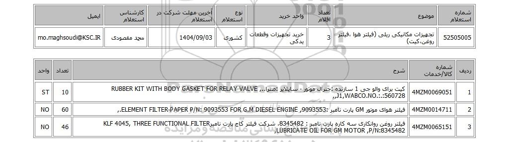 | 52505005 | تجهیزات مکانیکی ریلی (فیلتر هوا ،فیلتر روغن،کیت) | 3 | خرید تجهیزات وقطعات یدکی | کشوری | 1404/09/03 | محمد مقصودی | mo.maghsoudi@KSC.IR |