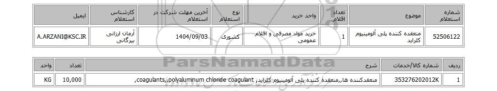 | 52506122 | منعقده کننده پلی آلومینیوم کلراید | 1 | خرید مواد مصرفی و اقلام عمومی | کشوری | 1404/09/03 | آرمان ارزانی بیرگانی | A.ARZANI@KSC.IR |