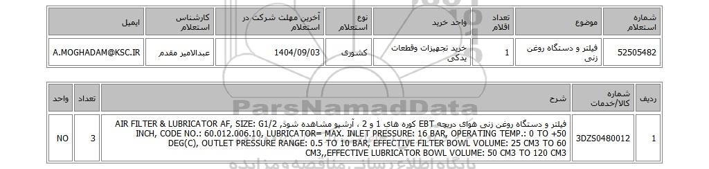 | 52505482 | فیلتر و دستگاه روغن زنی | 1 | خرید تجهیزات وقطعات یدکی | کشوری | 1404/09/03 | عبدالامیر مقدم | A.MOGHADAM@KSC.IR |
