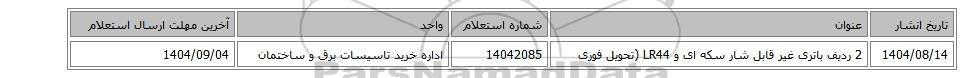 | 1404/08/14 | 2 ردیف باتری غیر قابل شار سکه ای و LR44 (تحویل فوری | 14042085 | اداره خرید تاسیسات برق و ساختمان | 1404/09/04 |
