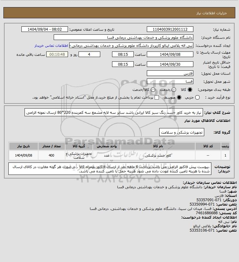شرح کلی نیاز: نیاز به خرید کاور جسد رنگ سبز کالا ایرانی باشد