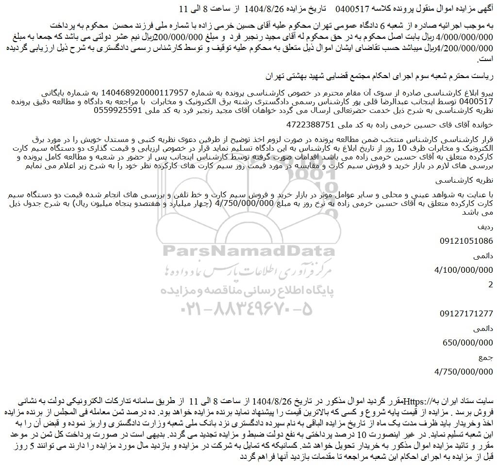 آگهی مزایده اموال منقول پرونده کلاسه 0400517 تاریخ مزایده 1404/8/26 از ساعت 8 الی 11