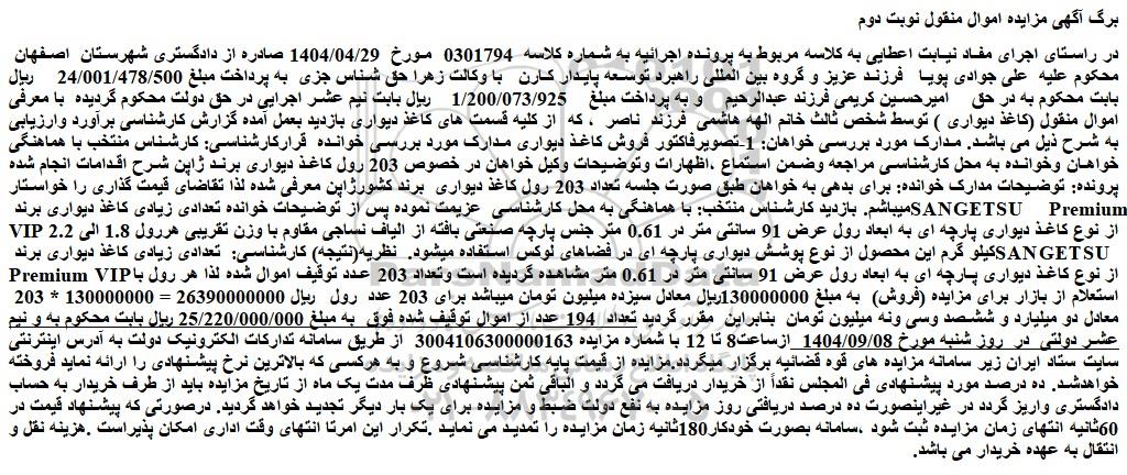 در راستای اجرای مفاد نیابت اعطایی به کلاسه مربوط به پرونده اجرائیه به شماره کلاسه 0301794 مورخ 1404/04/29 صادره از دادگستری شهرستان اصفهان محکوم علیه علی جوادی پویا فرزند عزیز و گروه بین المللی راهبرد توسعه پایدار کارن با وکالت زهرا حق شناس جزی به پرداخت مبلغ 24/001/478/500 ریال بابت محکوم به در حق امیرحسین کریمی فرزند عبدالرحیم و به پرداخت مبلغ 1/200/073/925 ریال بابت نیم عشر اجرایی در حق دولت محکوم گردیده با معرفی اموال منقول (کاغذ دیواری ) توسط شخص ثالث خانم الهه هاشمی فرزند ناصر ، که از کلیه قسمت های کاغذ دیواری بازدید بعمل آمده گزارش کارشناسی برآورد وارزیابی به شرح ذیل می باشد. مدارک مورد بررسی خواهان: 1-تصویرفاکتور فروش کاغذ دیواری مدارک مورد بررسی خوانده قرارکارشناسی: کارشناس منتخب با هماهنگی خواهان وخوانده به محل کارشناسی مراجعه وضمن استماع ،اظهارات وتوضیحات وکیل خواهان در خصوص 203 رول کاغذ دیواری برند ژاپن شرح اقدامات انجام شده پرونده: توضیحات مدارک خوانده: برای بدهی به خواهان طبق صورت جلسه تعداد 203 رول کاغذ دیواری برند کشورژاپن معرفی شده لذا تقاضای قیمت گذاری را خواستار میباشم. بازدید کارشناس منتخب: با هماهنگی به محل کارشناسی عزیمت نموده پس از توضیحات خوانده تعدادی زیادی کاغذ دیواری برند sangetsu premium vip از نوع کاغذ دیواری پارچه ای به ابعاد رول عرض 91 سانتی متر در 0.61 متر جنس پارچه صنعتی بافته از الیاف نساجی مقاوم با وزن تقریبی هررول 1.8 الی 2.2 کیلو گرم این محصول از نوع پوشش دیواری پارچه ای در فضاهای لوکس استفاده میشود. نظریه(نتیجه) کارشناسی: تعدادی زیادی کاغذ دیواری برند sangetsu premium vip از نوع کاغذ دیواری پارچه ای به ابعاد رول عرض 91 سانتی متر در 0.61 متر مشاهده گردیده است وتعداد 203 عدد توقیف اموال شده لذا هر رول با استعلام از بازار برای مزایده (فروش) به مبلغ 130000000ریال معادل سیزده میلیون تومان میباشد برای 203 عدد رول ریال 26390000000 = 130000000 * 203 معادل دو میلیارد و ششصد وسی ونه میلیون تومان بنابراین مقرر گردید تعداد 194 عدد از اموال توقیف شده فوق به مبلغ 25/220/000/000 ریال بابت محکوم به و نیم عشر دولتی در روز شنبه مورخ 1404/09/08 ازساعت8 تا 12 با شماره مزایده 3004106300000163 از طریق سامانه تدارکات الکترونیک دولت به آدرس اینترنتی سایت ستاد ایران زیر سامانه مزایده های قوه قضائیه برگزار میگردد.مزایده از قیمت پایه کارشناسی شروع و به هرکسی که بالاترین نرخ پیشنهادی را ارائه نماید فروخته خواهدشد. ده درصد مورد پیشنهادی فی المجلس نقداً از خریدار دریافت می گردد و الباقی ثمن پیشنهادی ظرف مدت یک ماه از تاریخ مزایده باید از طرف خریدار به حساب دادگستری واریز گردد در غیراینصورت ده درصد دریافتی روز مزایده به نفع دولت ضبط و مزایده برای یک بار دیگر تجدید خواهد گردید. درصورتی که پیشنهاد قیمت در 60ثانیه انتهای زمان مزایده ثبت شود ،سامانه بصورت خودکار180ثانیه زمان مزایده را تمدید می نماید .تکرار این امرتا انتهای وقت اداری امکان پذیراست .هزینه نقل و انتقال به عهده خریدار می باشد.