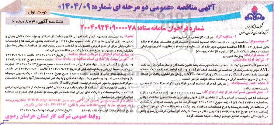 2- موضوع مناقصه: خرید 400 دستگاه تصحیح کننده با فشارکاری مختلف بهمراه 4 حلقه کابل نوری 04-HIE مناقصه عمومی دو مرحله ای شماره 1404.09) (مطابق با آخرین ویرایش استانداردهای شرکت ملی گاز ایران و الزامات پیوست)